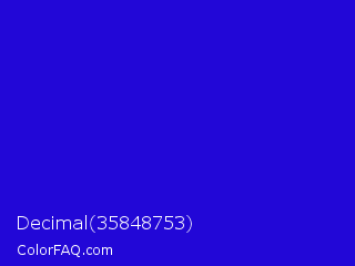 Decimal 35848753 Color is a normal indigo color and the nearest color is Interdimensional Blue #360ccc. Hex code #2207d7 and RGB value is rgb(34,7,215). In RGB color space, this color is composed of 13% red, 3% green, 84% blue, In CMYK color space, this color is composed of 84% cyan, 97% magenta, 0% yellow , 16% black , In HSL color space, this color has a hue angle of 248° , 94% saturation and 44% lightness.