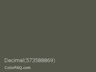 Decimal 573588869 Color is a normal lime color and the nearest color is Fuscous Gray #54534d. Hex code #545749 and RGB value is rgb(84,87,73). In RGB color space, this color is composed of 33% red, 34% green, 29% blue, In CMYK color space, this color is composed of 3% cyan, 0% magenta, 16% yellow , 66% black , In HSL color space, this color has a hue angle of 73° , 9% saturation and 31% lightness.