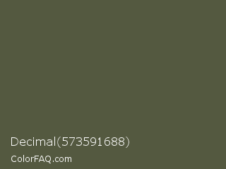 Decimal 573591688 Color is a dark lime color and the nearest color is Hemlock #5e5d3b. Hex code #545940 and RGB value is rgb(84,89,64). In RGB color space, this color is composed of 33% red, 35% green, 25% blue, In CMYK color space, this color is composed of 6% cyan, 0% magenta, 28% yellow , 65% black , In HSL color space, this color has a hue angle of 72° , 16% saturation and 30% lightness.
