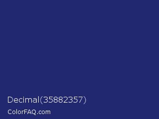 Decimal 35882357 Color is a dark blue color and the nearest color is St Patricks Blue #23297a. Hex code #22286f and RGB value is rgb(34,40,111). In RGB color space, this color is composed of 13% red, 16% green, 44% blue, In CMYK color space, this color is composed of 69% cyan, 64% magenta, 0% yellow , 56% black , In HSL color space, this color has a hue angle of 235° , 53% saturation and 28% lightness.