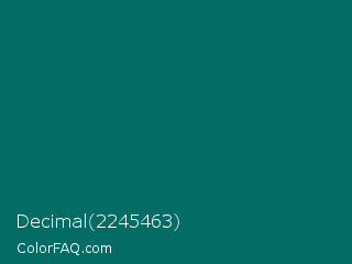 Decimal 2245463 Color is a very dark cyan color and the nearest color is Mosque #036a6e. Hex code #036c65 and RGB value is rgb(3,108,101). In RGB color space, this color is composed of 1% red, 42% green, 40% blue, In CMYK color space, this color is composed of 97% cyan, 0% magenta, 6% yellow , 58% black , In HSL color space, this color has a hue angle of 176° , 95% saturation and 22% lightness.