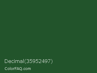 Decimal 35952497 Color is a dark green color and the nearest color is Cal Poly Pomona Green #1e4d2b. Hex code #22542b and RGB value is rgb(34,84,43). In RGB color space, this color is composed of 13% red, 33% green, 17% blue, In CMYK color space, this color is composed of 60% cyan, 0% magenta, 49% yellow , 67% black , In HSL color space, this color has a hue angle of 131° , 42% saturation and 23% lightness.