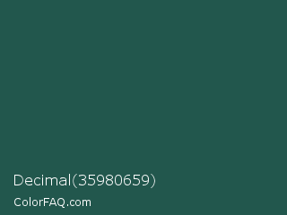 Decimal 35980659 Color is a dark cyan color and the nearest color is Plantation #27504b. Hex code #22574d and RGB value is rgb(34,87,77). In RGB color space, this color is composed of 13% red, 34% green, 30% blue, In CMYK color space, this color is composed of 61% cyan, 0% magenta, 11% yellow , 66% black , In HSL color space, this color has a hue angle of 169° , 44% saturation and 24% lightness.