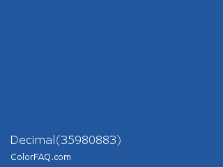 Decimal 35980883 Color is a normal blue color and the nearest color is Cyan Cobalt Blue #28589c. Hex code #22579d and RGB value is rgb(34,87,157). In RGB color space, this color is composed of 13% red, 34% green, 62% blue, In CMYK color space, this color is composed of 78% cyan, 45% magenta, 0% yellow , 38% black , In HSL color space, this color has a hue angle of 214° , 64% saturation and 37% lightness.