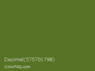 Decimal 575701798 Color is a dark green color and the nearest color is Dark Olive Green #556b2f. Hex code #577326 and RGB value is rgb(87,115,38). In RGB color space, this color is composed of 34% red, 45% green, 15% blue, In CMYK color space, this color is composed of 24% cyan, 0% magenta, 67% yellow , 55% black , In HSL color space, this color has a hue angle of 82° , 50% saturation and 30% lightness.