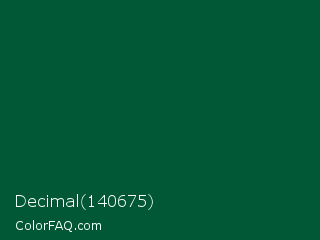 Decimal 140675 Color is a very dark green color and the nearest color is Sacramento State Green #00563f. Hex code #005837 and RGB value is rgb(0,88,55). In RGB color space, this color is composed of 0% red, 35% green, 22% blue, In CMYK color space, this color is composed of 100% cyan, 0% magenta, 38% yellow , 65% black , In HSL color space, this color has a hue angle of 158° , 100% saturation and 17% lightness.