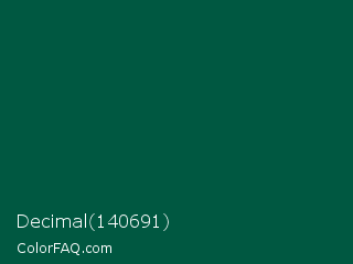 Decimal 140691 Color is a very dark cyan color and the nearest color is Sacramento State Green #00563f. Hex code #005841 and RGB value is rgb(0,88,65). In RGB color space, this color is composed of 0% red, 35% green, 25% blue, In CMYK color space, this color is composed of 100% cyan, 0% magenta, 26% yellow , 65% black , In HSL color space, this color has a hue angle of 164° , 100% saturation and 17% lightness.