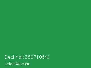 Decimal 36071064 Color is a normal green color and the nearest color is Sea Green #2e8b57. Hex code #22964a and RGB value is rgb(34,150,74). In RGB color space, this color is composed of 13% red, 59% green, 29% blue, In CMYK color space, this color is composed of 77% cyan, 0% magenta, 51% yellow , 41% black , In HSL color space, this color has a hue angle of 141° , 63% saturation and 36% lightness.