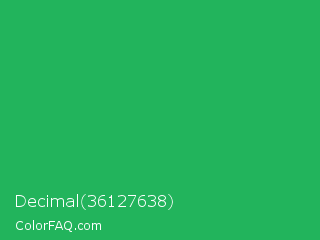 Decimal 36127638 Color is a normal green color and the nearest color is Green Crayola #1cac78. Hex code #22b45c and RGB value is rgb(34,180,92). In RGB color space, this color is composed of 13% red, 71% green, 36% blue, In CMYK color space, this color is composed of 81% cyan, 0% magenta, 49% yellow , 29% black , In HSL color space, this color has a hue angle of 144° , 68% saturation and 42% lightness.