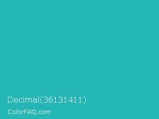 Decimal 36131411 Color is a normal cyan color and the nearest color is Light Sea Green #20b2aa. Hex code #22b7b5 and RGB value is rgb(34,183,181). In RGB color space, this color is composed of 13% red, 72% green, 71% blue, In CMYK color space, this color is composed of 81% cyan, 0% magenta, 1% yellow , 28% black , In HSL color space, this color has a hue angle of 179° , 69% saturation and 43% lightness.