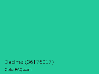 Decimal 36176017 Color is a normal green color and the nearest color is Shamrock #33cc99. Hex code #22ca9b and RGB value is rgb(34,202,155). In RGB color space, this color is composed of 13% red, 79% green, 61% blue, In CMYK color space, this color is composed of 83% cyan, 0% magenta, 23% yellow , 21% black , In HSL color space, this color has a hue angle of 163° , 71% saturation and 46% lightness.