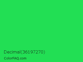 Decimal 36197270 Color is a normal green color and the nearest color is Malachite #0bda51. Hex code #22df54 and RGB value is rgb(34,223,84). In RGB color space, this color is composed of 13% red, 87% green, 33% blue, In CMYK color space, this color is composed of 85% cyan, 0% magenta, 62% yellow , 13% black , In HSL color space, this color has a hue angle of 136° , 75% saturation and 50% lightness.