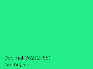 Decimal 36212785 Color is a normal green color and the nearest color is Spring Green #00ff7f. Hex code #22ed87 and RGB value is rgb(34,237,135). In RGB color space, this color is composed of 13% red, 93% green, 53% blue, In CMYK color space, this color is composed of 86% cyan, 0% magenta, 43% yellow , 7% black , In HSL color space, this color has a hue angle of 150° , 85% saturation and 53% lightness.
