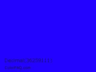 Decimal 36259111 Color is a normal indigo color and the nearest color is Electric Ultramarine #3f00ff. Hex code #2302ff and RGB value is rgb(35,2,255). In RGB color space, this color is composed of 14% red, 1% green, 100% blue, In CMYK color space, this color is composed of 86% cyan, 99% magenta, 0% yellow , 0% black , In HSL color space, this color has a hue angle of 248° , 100% saturation and 50% lightness.