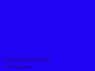 Decimal 36259700 Color is a normal indigo color and the nearest color is Bluebonnet #1c1cf0. Hex code #2303f6 and RGB value is rgb(35,3,246). In RGB color space, this color is composed of 14% red, 1% green, 96% blue, In CMYK color space, this color is composed of 86% cyan, 99% magenta, 0% yellow , 4% black , In HSL color space, this color has a hue angle of 248° , 98% saturation and 49% lightness.