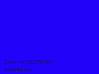 Decimal 36259702 Color is a normal indigo color and the nearest color is Bluebonnet #1c1cf0. Hex code #2303f8 and RGB value is rgb(35,3,248). In RGB color space, this color is composed of 14% red, 1% green, 97% blue, In CMYK color space, this color is composed of 86% cyan, 99% magenta, 0% yellow , 3% black , In HSL color space, this color has a hue angle of 248° , 98% saturation and 49% lightness.