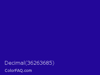 Decimal 36263685 Color is a normal indigo color and the nearest color is Blue Gem #2c0e8c. Hex code #230799 and RGB value is rgb(35,7,153). In RGB color space, this color is composed of 14% red, 3% green, 60% blue, In CMYK color space, this color is composed of 77% cyan, 95% magenta, 0% yellow , 40% black , In HSL color space, this color has a hue angle of 252° , 91% saturation and 31% lightness.