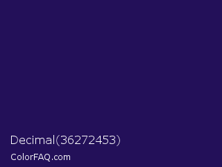 Decimal 36272453 Color is a very dark indigo color and the nearest color is Violent Violet #290c5e. Hex code #231059 and RGB value is rgb(35,16,89). In RGB color space, this color is composed of 14% red, 6% green, 35% blue, In CMYK color space, this color is composed of 61% cyan, 82% magenta, 0% yellow , 65% black , In HSL color space, this color has a hue angle of 256° , 70% saturation and 21% lightness.