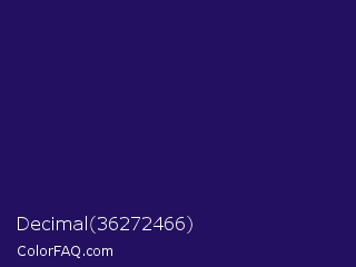 Decimal 36272466 Color is a very dark indigo color and the nearest color is Violent Violet #290c5e. Hex code #231060 and RGB value is rgb(35,16,96). In RGB color space, this color is composed of 14% red, 6% green, 38% blue, In CMYK color space, this color is composed of 64% cyan, 83% magenta, 0% yellow , 62% black , In HSL color space, this color has a hue angle of 254° , 71% saturation and 22% lightness.