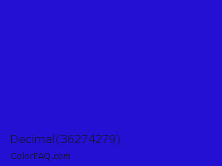 Decimal 36274279 Color is a normal indigo color and the nearest color is Interdimensional Blue #360ccc. Hex code #2310d3 and RGB value is rgb(35,16,211). In RGB color space, this color is composed of 14% red, 6% green, 83% blue, In CMYK color space, this color is composed of 83% cyan, 92% magenta, 0% yellow , 17% black , In HSL color space, this color has a hue angle of 246° , 86% saturation and 45% lightness.