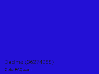 Decimal 36274288 Color is a normal indigo color and the nearest color is Interdimensional Blue #360ccc. Hex code #2310d6 and RGB value is rgb(35,16,214). In RGB color space, this color is composed of 14% red, 6% green, 84% blue, In CMYK color space, this color is composed of 84% cyan, 93% magenta, 0% yellow , 16% black , In HSL color space, this color has a hue angle of 246° , 86% saturation and 45% lightness.