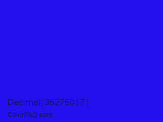 Decimal 36275017 Color is a normal indigo color and the nearest color is Bluebonnet #1c1cf0. Hex code #2311ed and RGB value is rgb(35,17,237). In RGB color space, this color is composed of 14% red, 7% green, 93% blue, In CMYK color space, this color is composed of 85% cyan, 93% magenta, 0% yellow , 7% black , In HSL color space, this color has a hue angle of 245° , 87% saturation and 50% lightness.
