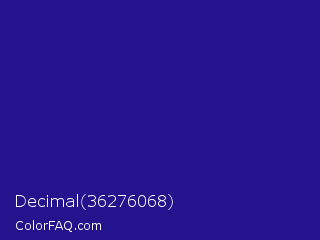 Decimal 36276068 Color is a normal indigo color and the nearest color is Blue Gem #2c0e8c. Hex code #23138c and RGB value is rgb(35,19,140). In RGB color space, this color is composed of 14% red, 7% green, 55% blue, In CMYK color space, this color is composed of 75% cyan, 86% magenta, 0% yellow , 45% black , In HSL color space, this color has a hue angle of 248° , 76% saturation and 31% lightness.