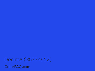 Decimal 36774952 Color is a normal blue color and the nearest color is Palatinate Blue #273be2. Hex code #2348ec and RGB value is rgb(35,72,236). In RGB color space, this color is composed of 14% red, 28% green, 93% blue, In CMYK color space, this color is composed of 85% cyan, 69% magenta, 0% yellow , 7% black , In HSL color space, this color has a hue angle of 229° , 84% saturation and 53% lightness.