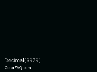 Decimal 8979 Color is a almost black cyan color and the nearest color is Rich Black FOGRA39 #010203. Hex code #000909 and RGB value is rgb(0,9,9). In RGB color space, this color is composed of 0% red, 4% green, 4% blue, In CMYK color space, this color is composed of 100% cyan, 0% magenta, 0% yellow , 96% black , In HSL color space, this color has a hue angle of 180° , 100% saturation and 2% lightness.