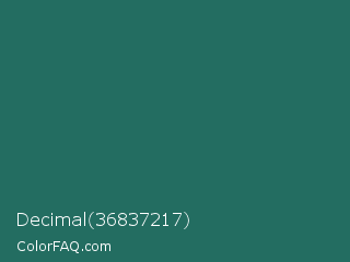 Decimal 36837217 Color is a dark cyan color and the nearest color is Genoa #15736b. Hex code #236d61 and RGB value is rgb(35,109,97). In RGB color space, this color is composed of 14% red, 43% green, 38% blue, In CMYK color space, this color is composed of 68% cyan, 0% magenta, 11% yellow , 57% black , In HSL color space, this color has a hue angle of 170° , 51% saturation and 28% lightness.