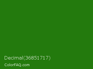 Decimal 36851717 Color is a dark green color and the nearest color is Napier Green #2a8000. Hex code #237a0d and RGB value is rgb(35,122,13). In RGB color space, this color is composed of 14% red, 48% green, 5% blue, In CMYK color space, this color is composed of 71% cyan, 0% magenta, 89% yellow , 52% black , In HSL color space, this color has a hue angle of 108° , 81% saturation and 26% lightness.