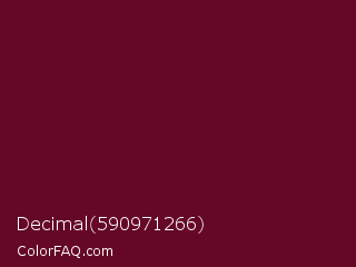 Decimal 590971266 Color is a very dark rose color and the nearest color is Black Rose #67032d. Hex code #650726 and RGB value is rgb(101,7,38). In RGB color space, this color is composed of 40% red, 3% green, 15% blue, In CMYK color space, this color is composed of 0% cyan, 93% magenta, 62% yellow , 60% black , In HSL color space, this color has a hue angle of 340° , 87% saturation and 21% lightness.