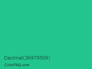 Decimal 36979509 Color is a normal green color and the nearest color is Mountain Meadow #30ba8f. Hex code #23c58f and RGB value is rgb(35,197,143). In RGB color space, this color is composed of 14% red, 77% green, 56% blue, In CMYK color space, this color is composed of 82% cyan, 0% magenta, 27% yellow , 23% black , In HSL color space, this color has a hue angle of 160° , 70% saturation and 45% lightness.
