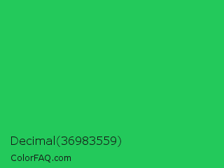Decimal 36983559 Color is a normal green color and the nearest color is Malachite #0bda51. Hex code #23c95b and RGB value is rgb(35,201,91). In RGB color space, this color is composed of 14% red, 79% green, 36% blue, In CMYK color space, this color is composed of 83% cyan, 0% magenta, 55% yellow , 21% black , In HSL color space, this color has a hue angle of 140° , 70% saturation and 46% lightness.