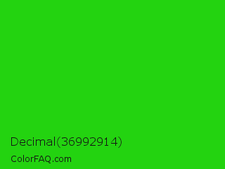 Decimal 36992914 Color is a normal green color and the nearest color is Harlequin Green #46cb18. Hex code #23d310 and RGB value is rgb(35,211,16). In RGB color space, this color is composed of 14% red, 83% green, 6% blue, In CMYK color space, this color is composed of 83% cyan, 0% magenta, 92% yellow , 17% black , In HSL color space, this color has a hue angle of 114° , 86% saturation and 45% lightness.