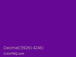 Decimal 592614246 Color is a normal purple color and the nearest color is Purple #660099. Hex code #670796 and RGB value is rgb(103,7,150). In RGB color space, this color is composed of 40% red, 3% green, 59% blue, In CMYK color space, this color is composed of 31% cyan, 95% magenta, 0% yellow , 41% black , In HSL color space, this color has a hue angle of 280° , 91% saturation and 31% lightness.
