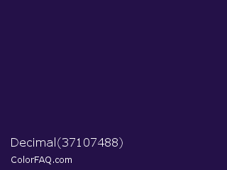 Decimal 37107488 Color is a very dark violet color and the nearest color is Violet #240a40. Hex code #241148 and RGB value is rgb(36,17,72). In RGB color space, this color is composed of 14% red, 7% green, 28% blue, In CMYK color space, this color is composed of 50% cyan, 76% magenta, 0% yellow , 72% black , In HSL color space, this color has a hue angle of 261° , 62% saturation and 17% lightness.