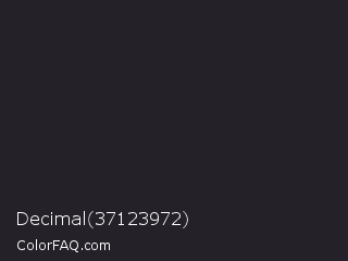 Decimal 37123972 Color is a very dark violet color and the nearest color is Raisin Black #242124. Hex code #242128 and RGB value is rgb(36,33,40). In RGB color space, this color is composed of 14% red, 13% green, 16% blue, In CMYK color space, this color is composed of 10% cyan, 18% magenta, 0% yellow , 84% black , In HSL color space, this color has a hue angle of 266° , 10% saturation and 14% lightness.