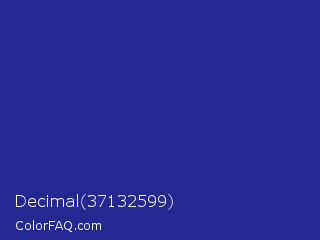Decimal 37132599 Color is a normal blue color and the nearest color is Jacksons Purple #20208d. Hex code #242991 and RGB value is rgb(36,41,145). In RGB color space, this color is composed of 14% red, 16% green, 57% blue, In CMYK color space, this color is composed of 75% cyan, 72% magenta, 0% yellow , 43% black , In HSL color space, this color has a hue angle of 237° , 60% saturation and 35% lightness.