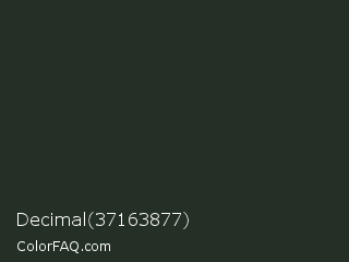 Decimal 37163877 Color is a very dark green color and the nearest color is Charleston Green #232b2b. Hex code #242f25 and RGB value is rgb(36,47,37). In RGB color space, this color is composed of 14% red, 18% green, 15% blue, In CMYK color space, this color is composed of 23% cyan, 0% magenta, 21% yellow , 82% black , In HSL color space, this color has a hue angle of 125° , 13% saturation and 16% lightness.