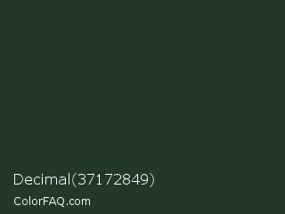 Decimal 37172849 Color is a very dark green color and the nearest color is Black Leather Jacket #253529. Hex code #243827 and RGB value is rgb(36,56,39). In RGB color space, this color is composed of 14% red, 22% green, 15% blue, In CMYK color space, this color is composed of 36% cyan, 0% magenta, 30% yellow , 78% black , In HSL color space, this color has a hue angle of 129° , 22% saturation and 18% lightness.