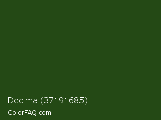 Decimal 37191685 Color is a very dark green color and the nearest color is Green House #24500f. Hex code #244915 and RGB value is rgb(36,73,21). In RGB color space, this color is composed of 14% red, 29% green, 8% blue, In CMYK color space, this color is composed of 51% cyan, 0% magenta, 71% yellow , 71% black , In HSL color space, this color has a hue angle of 103° , 55% saturation and 18% lightness.