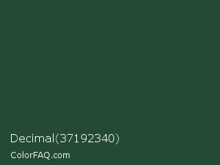 Decimal 37192340 Color is a very dark green color and the nearest color is Te Papa Green #1e433c. Hex code #244a36 and RGB value is rgb(36,74,54). In RGB color space, this color is composed of 14% red, 29% green, 21% blue, In CMYK color space, this color is composed of 51% cyan, 0% magenta, 27% yellow , 71% black , In HSL color space, this color has a hue angle of 148° , 35% saturation and 22% lightness.