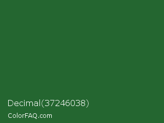 Decimal 37246038 Color is a dark green color and the nearest color is Mughal Green #306030. Hex code #246630 and RGB value is rgb(36,102,48). In RGB color space, this color is composed of 14% red, 40% green, 19% blue, In CMYK color space, this color is composed of 65% cyan, 0% magenta, 53% yellow , 60% black , In HSL color space, this color has a hue angle of 131° , 48% saturation and 27% lightness.