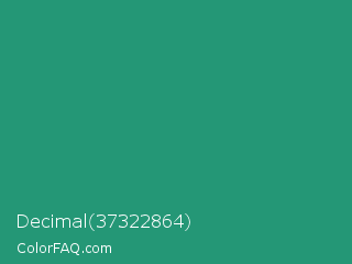 Decimal 37322864 Color is a normal green color and the nearest color is Illuminating Emerald #319177. Hex code #249776 and RGB value is rgb(36,151,118). In RGB color space, this color is composed of 14% red, 59% green, 46% blue, In CMYK color space, this color is composed of 76% cyan, 0% magenta, 22% yellow , 41% black , In HSL color space, this color has a hue angle of 163° , 61% saturation and 37% lightness.