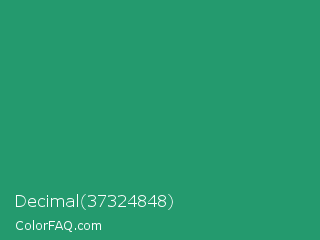 Decimal 37324848 Color is a normal green color and the nearest color is Illuminating Emerald #319177. Hex code #249a6e and RGB value is rgb(36,154,110). In RGB color space, this color is composed of 14% red, 60% green, 43% blue, In CMYK color space, this color is composed of 77% cyan, 0% magenta, 29% yellow , 40% black , In HSL color space, this color has a hue angle of 158° , 62% saturation and 37% lightness.