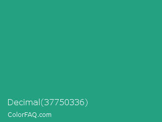 Decimal 37750336 Color is a normal cyan color and the nearest color is Jungle Green #29ab87. Hex code #24a180 and RGB value is rgb(36,161,128). In RGB color space, this color is composed of 14% red, 63% green, 50% blue, In CMYK color space, this color is composed of 78% cyan, 0% magenta, 20% yellow , 37% black , In HSL color space, this color has a hue angle of 164° , 63% saturation and 39% lightness.