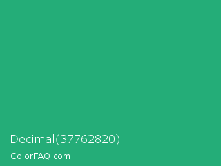 Decimal 37762820 Color is a normal green color and the nearest color is Green Crayola #1cac78. Hex code #24ad78 and RGB value is rgb(36,173,120). In RGB color space, this color is composed of 14% red, 68% green, 47% blue, In CMYK color space, this color is composed of 79% cyan, 0% magenta, 31% yellow , 32% black , In HSL color space, this color has a hue angle of 157° , 66% saturation and 41% lightness.