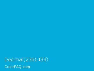 Decimal 2361433 Color is a normal cyan color and the nearest color is Cerulean #02a4d3. Hex code #03acdb and RGB value is rgb(3,172,219). In RGB color space, this color is composed of 1% red, 67% green, 86% blue, In CMYK color space, this color is composed of 99% cyan, 21% magenta, 0% yellow , 14% black , In HSL color space, this color has a hue angle of 193° , 97% saturation and 44% lightness.