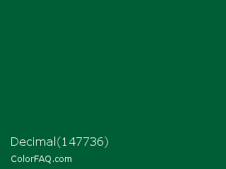 Decimal 147736 Color is a very dark green color and the nearest color is Sacramento State Green #00563f. Hex code #005e36 and RGB value is rgb(0,94,54). In RGB color space, this color is composed of 0% red, 37% green, 21% blue, In CMYK color space, this color is composed of 100% cyan, 0% magenta, 43% yellow , 63% black , In HSL color space, this color has a hue angle of 154° , 100% saturation and 18% lightness.